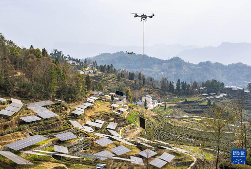 2月13日,技術(shù)人員在湖北省宜昌市秭歸縣茅坪鎮(zhèn)花果園村光伏電站建設(shè)現(xiàn)場用無人機(jī)吊裝光伏板(無人機(jī)照片)。(新華社發(fā) 鄭家裕 攝)