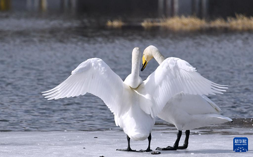 3月4日,天鵝在密云水庫流域的清水河嬉戲。(新華社記者 李欣 攝)