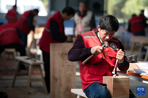 月6日,參賽選手在參加木作文物修復(fù)師項(xiàng)目比賽。(新華社記者 張端 攝)