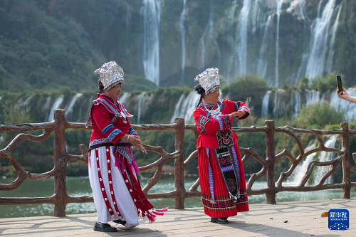 3月10日,游人在云南省曲靖市羅平九龍瀑布群風(fēng)景區(qū)拍照。(新華社發(fā) 彭奕凱 攝)