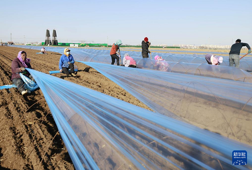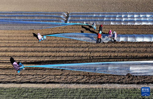 3月11日,豐南區(qū)岔河鎮(zhèn)四神莊一村的農(nóng)民在田間為剛播種的馬鈴薯覆膜。(新華社記者 楊世堯 攝)