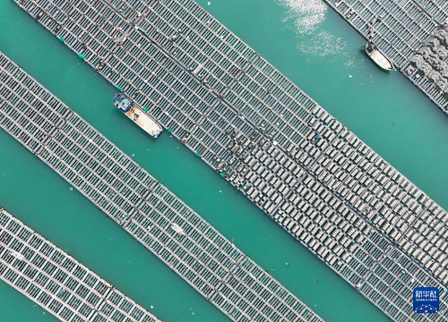 3月12日,漁民在連江縣苔菉鎮(zhèn)附近海域投放鮑魚苗(無人機照片)。(新華社記者 林善傳 攝)