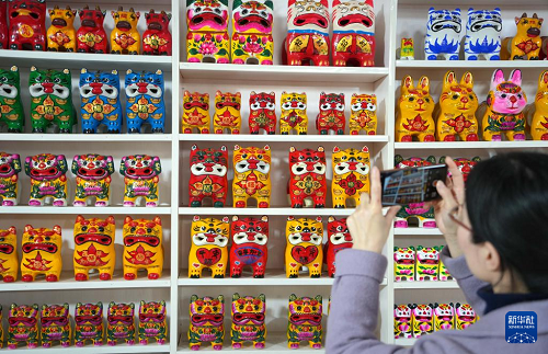 3月19日,一名參觀者在姜莊鎮(zhèn)用手機拍攝泥老虎產(chǎn)品。(新華社記者 徐速繪 攝)