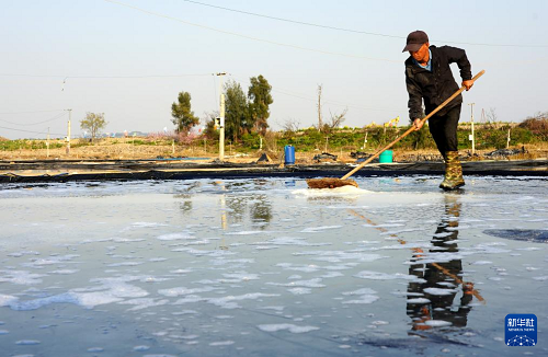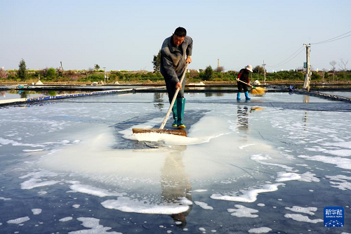 春日氣溫回升,正是采用日曬、調(diào)鹵、結(jié)晶等古法曬鹽的好時(shí)節(jié),在浙江省樂(lè)清市南塘鎮(zhèn)山馬曬鹽場(chǎng),工作人員趁著晴好天氣忙著曬鹽收鹽。