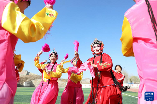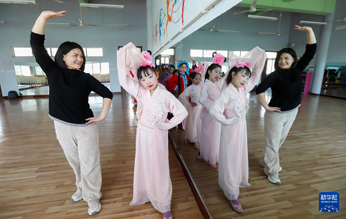 3月25日,在河北省唐山市豐潤區(qū)泉河頭鎮(zhèn)團(tuán)山子小學(xué),評劇演員在教學(xué)生戲曲動作。(新華社發(fā) 朱大勇 攝)