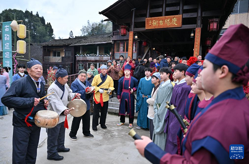 3月30日,人們身著傳統(tǒng)服飾在宣恩縣椒園鎮(zhèn)慶陽古街前表演國家級非物質(zhì)文化遺產(chǎn)“薅草鑼鼓”。(新華社發(fā) 宋文 攝)