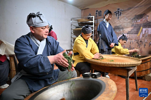 3月30日,村民在湖宣恩縣椒園鎮(zhèn)慶陽古街表演手工制茶。(新華社發(fā) 陳緒開 攝)