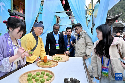 3月30日,游客在宣恩縣椒園鎮(zhèn)慶陽古街觀看手工抹茶制作。(新華社發(fā) 陳緒開 攝)