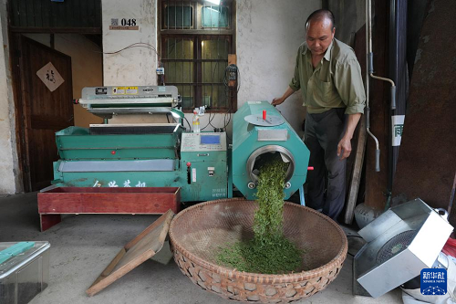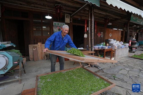 4月10日,在磐安縣尖山鎮(zhèn)烏石村,村民在翻動茶青。(新華社記者 翁忻旸 攝)
