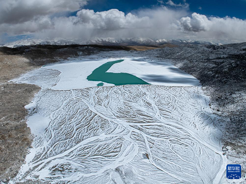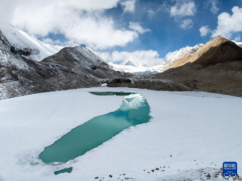 4月13日拍攝的普拉喜瓊峰腳下的曲隆嘎木措冰川湖(無人機(jī)照片)。(新華社發(fā) 董志雄 攝)