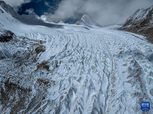 空中俯瞰普拉喜瓊峰腳下的曲隆嘎木冰川(4月13日攝,無人機(jī)照片)。(新華社發(fā) 董志雄 攝)