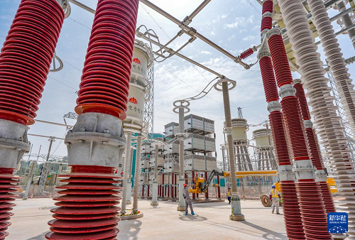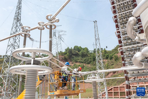 4月16日,安徽送變電工程有限公司施工人員在“疆電入渝”特高壓工程渝北換流站建設(shè)現(xiàn)場對電容器塔設(shè)備進行調(diào)試驗收。(新華社記者 黃偉 攝)