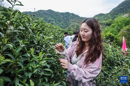 4月16日,參加茶文化主題活動(dòng)的市民在建德市新安江街道嶺后大坪茶園體驗(yàn)采茶。(新華社記者 徐昱 攝)