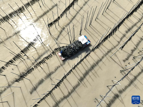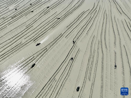 4月15日,福建省霞浦縣沙江鎮(zhèn)海域海帶養(yǎng)殖戶在收獲晾曬后的海帶(無人機照片)。(新華社記者 姜克紅 攝)