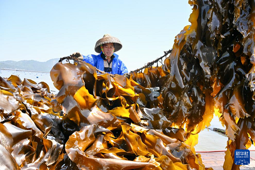 4月15日,福建省霞浦縣沙江鎮(zhèn)海帶養(yǎng)殖戶在海上收海帶。(新華社記者 姜克紅 攝)