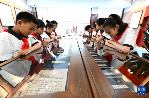 4月21日,石家莊市實驗小學(xué)學(xué)生在石家莊市圖書館參觀手抄中國名著展覽。(新華社發(fā) 陳其保 攝)