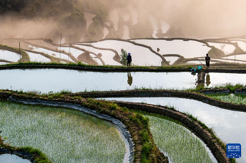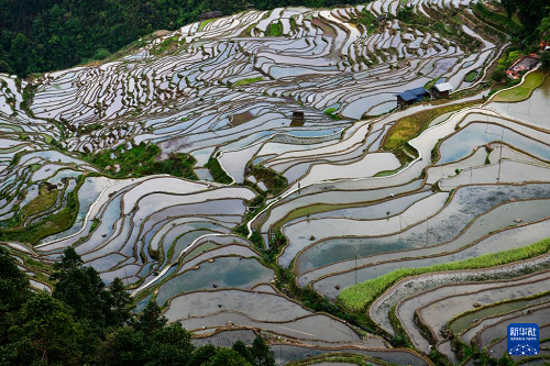 4月28日,村民在貴州省從江縣加榜梯田查看稻田蓄水情況。(新華社記者 楊文斌 攝)