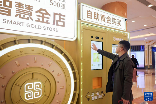 5月5日,在上海市普陀區(qū)一家商場內(nèi)的“智慧金店”,市民了解自助黃金購買設(shè)備。(新華社記者 王翔 攝)