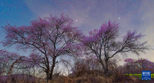 5月2日在黑龍江省佳木斯市富錦市錦山鎮(zhèn)拍攝的星空下的杏花。(新華社發(fā) 曲玉寶 攝)