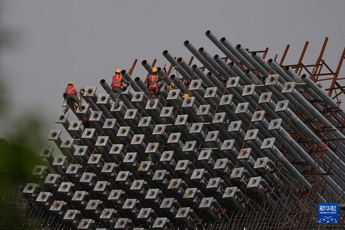 5月6日,中國鐵建大橋局建設(shè)者在雙嶼門特大橋六橫側(cè)索塔高空平臺施工。(新華社記者 黃宗治 攝)