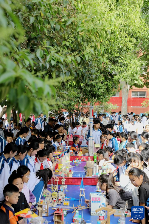 5月7日,在河南省濟(jì)源市軹城鎮(zhèn)校園科技節(jié)活動上,同學(xué)們在參觀科技小制作。(新華社發(fā) 段二平 攝)