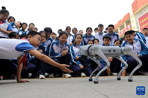 5月7日,在河南省濟(jì)源市軹城鎮(zhèn)校園科技節(jié)活動上,同學(xué)們與機(jī)器狗互動。(新華社發(fā) 段二平 攝)
