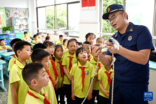 5月9日,消防救援人員給四川省眉山市彭山區(qū)第三中學(xué)的學(xué)生講解安全繩知識(shí)。(新華社發(fā) 翁光建 攝)
