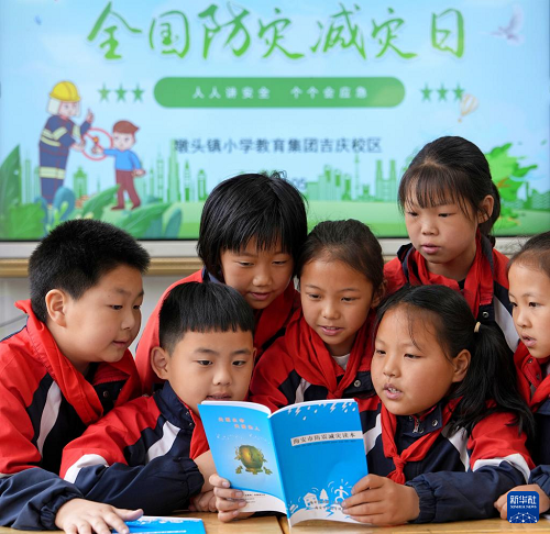 5月9日,江蘇省海安市墩頭鎮(zhèn)小學(xué)教育集團(tuán)吉慶校區(qū)的學(xué)生在閱讀防震減災(zāi)讀本。(新華社發(fā) 周強(qiáng) 攝)