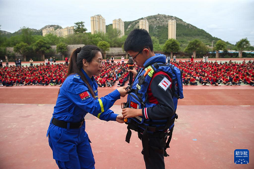 5月9日,在山東省濟(jì)南市泉海小學(xué),藍(lán)天救援隊(duì)志愿者給學(xué)生講解、演示救援服穿法。(新華社發(fā) 郝鑫城 攝)
