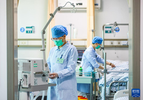 5月12日,在江蘇省揚州市江都中醫(yī)院康復(fù)科,護士為患者調(diào)節(jié)呼吸機。(新華社發(fā) 任飛 攝)