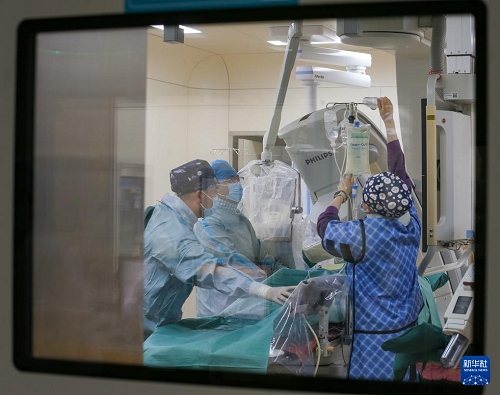 5月12日,在江蘇省句容市人民醫(yī)院介入手術(shù)室,醫(yī)護人員在進(jìn)行冠狀動脈支架植入術(shù)。(新華社發(fā) 鐘學(xué)滿 攝)