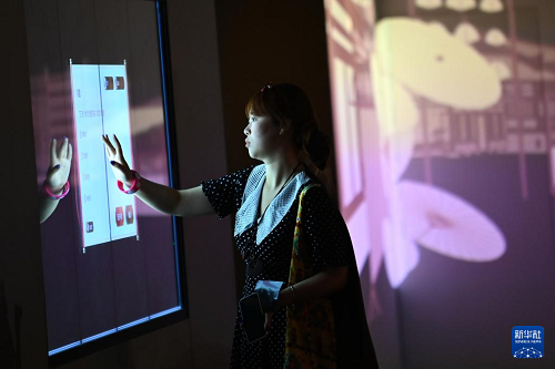 5月12日,游客在改擴建后的西安碑林博物館北區(qū)場館進行互動體驗。(新華社記者 李一博 攝)