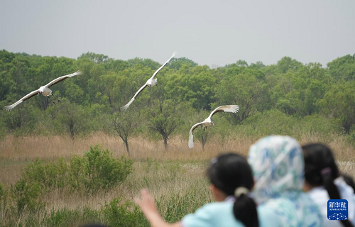 5月14日,幾只丹頂鶴在黃河三角洲國家級自然保護(hù)區(qū)內(nèi)飛翔。(新華社記者 徐速繪 攝)