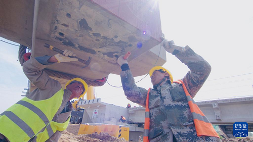 5月19日,工人在沈山鐵路鴨子河中橋新建大橋架梁工程現(xiàn)場(chǎng)施工。(新華社發(fā) 徐鳴禹 攝)