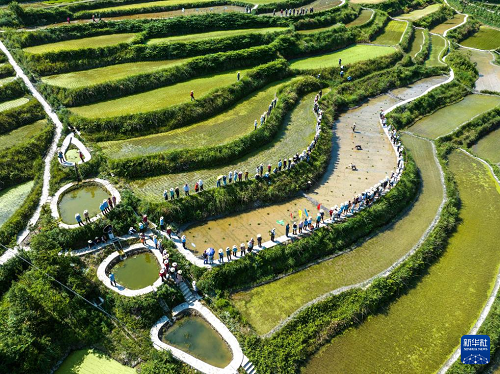 5月21日,湖北省宜昌市秭歸縣兩河口鎮(zhèn)農(nóng)民在二甲村水田里參加插秧比賽(無人機照片)。(新華社發(fā) 王罡 攝)