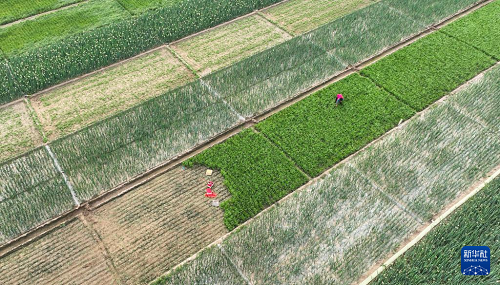5月21日,農(nóng)戶在河北省石家莊市藁城區(qū)常安鎮(zhèn)里莊村田地忙碌(無人機照片)。(新華社發(fā) 梁子棟 攝)