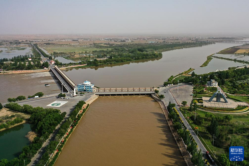 這是5月28日拍攝的位于巴彥淖爾市磴口縣的三盛公水利樞紐(無(wú)人機(jī)照片)。(新華社記者 李志鵬 攝)