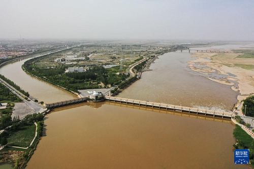 這是5月28日拍攝的巴彥淖爾市臨河區(qū)境內(nèi)的總干渠第二分水樞紐(無(wú)人機(jī)照片)。(新華社記者 李志鵬 攝)