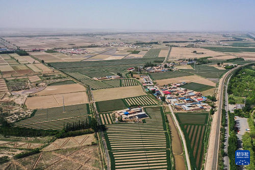 這是5月28日拍攝的巴彥淖爾市磴口縣境內(nèi)的農(nóng)田(無(wú)人機(jī)照片)。(新華社記者 李志鵬 攝)