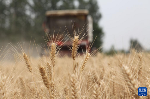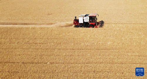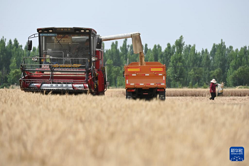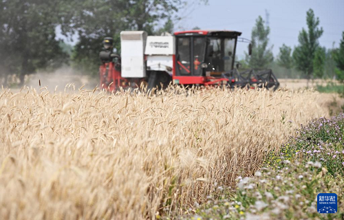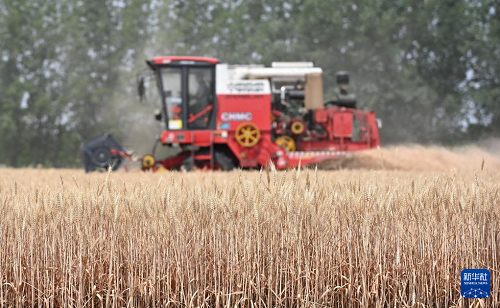 6月2日,農(nóng)機(jī)手駕駛聯(lián)合收割機(jī)在山東省聊城市茌平區(qū)賈寨鎮(zhèn)草林張村麥田里收割小麥。(新華社發(fā) 趙玉國 攝)