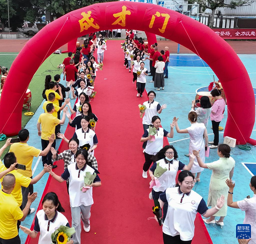 6月3日,在重慶市永川區(qū),萱花中學(xué)高三學(xué)子在教師的祝福聲中,依次邁入“成長門、成才門、成功門”。(新華社發(fā) 陳仕川 攝)