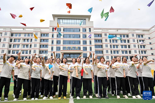 6月3日,在湖北省襄陽市??悼h第一中學(xué),高三學(xué)生在操場(chǎng)上放飛寫有自己心愿的紙飛機(jī)。(新華社發(fā) 楊韜 攝)