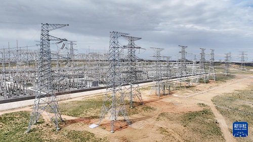 6月8日拍攝的寧國運靈武100萬千瓦光伏復合項目330千伏輸變電工程線路終點——北地750千伏變電站(無人機照片)。(新華社記者 王鵬 攝)