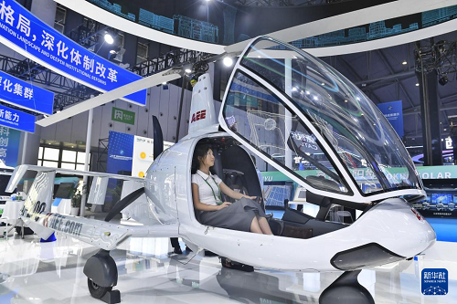 6月11日,一名觀眾在體驗(yàn)展出的飛機(jī)。(新華社記者 劉坤 攝)