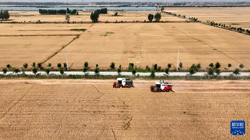 6月12日,收割機(jī)在河北省邢臺市隆堯縣雙碑鄉(xiāng)西良村麥田里收獲小麥(無人機(jī)照片)。(新華社記者 牟宇 攝)