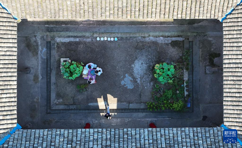 7月3日,游客在五泄鎮(zhèn)古民居內(nèi)體驗漆扇制作(無人機照片)。(新華社記者 翁忻旸 攝)