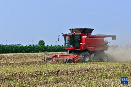 7月8日,收割機(jī)在作業(yè),為后續(xù)播種大豆做準(zhǔn)備。(新華社記者 吳青昊 攝)