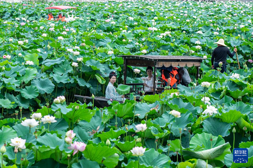 7月12日,游客在湖南省婁底市婁星區(qū)青山公園泛舟賞荷。(新華社發(fā) 吳永華 攝)