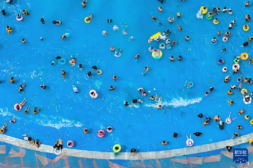 7月12日,游客在天津?yàn)I海新區(qū)方特水上樂園戲水納涼(無人機(jī)照片)。(新華社發(fā) 杜鵬輝 攝)