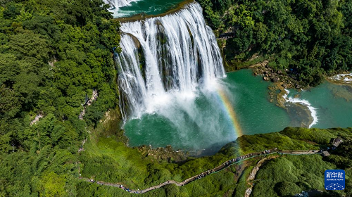 近日,位于貴州省安順市的黃果樹瀑布景區(qū)正處于夏日最佳觀賞期。黃果樹大瀑布水勢磅礴,在陽光的照射下,瀑布前架起一道彩虹,美麗的景象吸引各地游客前來觀賞游玩。